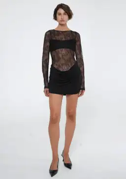 The Yana Lace Mini Dress features a long sleeve stretch lace bodysuit with an open back and internal bra shelf at front bust. The cowl mini skirt adds a touch of elegance to the front of the bodysuit. Perfect for a special occasion or night out, the dress is designed to make a statement with its understated allure.