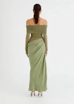 The Yasmin Maxi Dress features a beautiful off-shoulder design with a flattering cowl on the wearers left side waist. The overlapping skirt adds a touch of sophistication while the mesh bodice. Perfect for any special occasion.