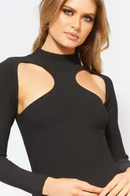 Mix up your wardrobe with our Chantelle Dress. This Black mini is easy to wear, featuring long sleeves, a high neck and a unique cut out design along the décolletage. Pair with a strappy pair of heels to complete this look!