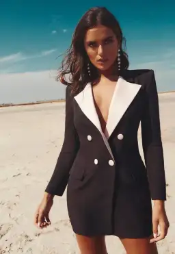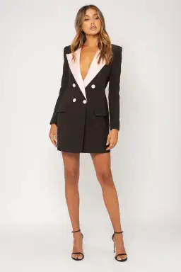 The Lola Dress is a tuxedo style blazer dress with exaggerated peak Blush lapels and buttons. This two-tone blazer is an essential statement piece for your wardrobe. Perfect for day or evening.