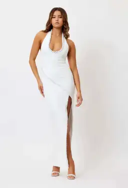 Introducing the Laura Pearl Dress. This dress is a sophisticated and elegant style that incorporates delicate pearl embellishments into its design. The standout feature of this dress is the pearl trim placed along the neckline and waist. This dress exudes timeless charm and sophistication. It is a perfect choice for formal or semi-formal events, allowing you to make a refined and elegant statement.