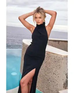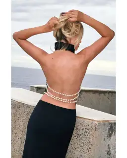 Very elegant, classy, black night dress. This dress is a sophisticated and elegant style that incorporates delicate pearl embellishments into its design. The standout feature of this dress is the backless look and pearl trims placed at the back.