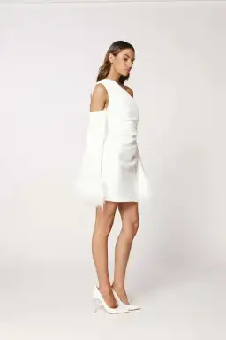 Our Dezi dress is a timeless piece to rent for a special occasion. Featuring an asymmetric shoulder neckline with a cut out sleeve design that is complemented by our signature feathers.