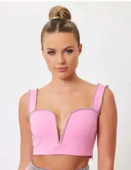 The crop top features a low neckline and crystals at the straps and the neckline. The pant features a wide leg, side pockets and a statement waistband with crystals.