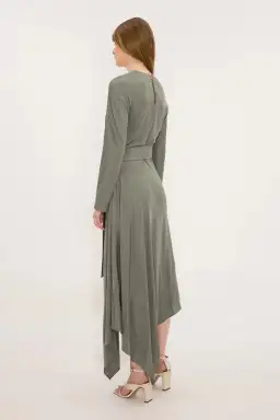Constructed from a sophisticated Sage jersey. With an asymmetric hem and integrated wrap ties to cinch the waist, this long sleeve garment elevates a classic design