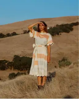 A striking midi‑length dress by Binny, the “Sampson Road” features a relaxed but flattering silhouette in a Size AU 12 that drapes beautifully. The dress has a soft bodice with short or 3/4 puffed sleeves, a defined waist often enhanced with a removable tie or subtle gathering, and flows into a gently flared skirt that ends below the knee.