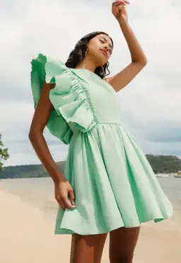 "The Bonjour Asymmetric Mini Dress is a showstopping style in a bright Marine Green hue. The fitted one shoulder bodice is finished with an asymmetric neckline and exaggerated shoulder frill with raw edging, and is met by a relaxed mini skirt with side seam pockets."