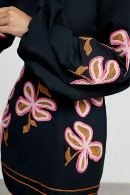 Black mini dress, non stretch fabric, with pink and orange embroidery detail. Button closure at neck and zip closure at waist.