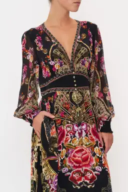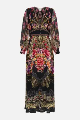 - Dance With Duende takes us to the vibrant flare of Spain, taking inspiration from our archived El Duende collection - Black print with golden and floral details - Luxury silk dress