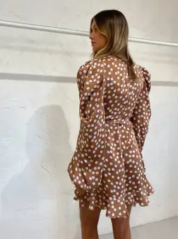 By Johnny Brielle Frill Wrap Mini Dress Brown Spot Size 10