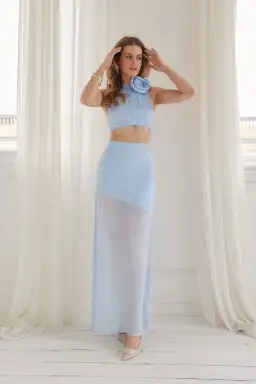 · Asymmetric mini skirt lines a sheer floor length maxi skirt