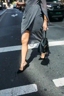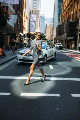 This cool Camilla and Marc dress in black and white check can either be dressed up or dressed down. With long sheer sleeves with slightly flared cuffs, with side ruching that accentuates the waist and flares to the bottom. As seen on Kate Waterhouse.