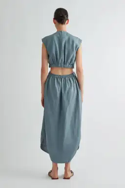 The extremely flattering CAMILLA AND MARC Cora Midi Dress in Dusty Blue. Midi dress in 100% soft linen with soft pleats and gathers. Cut out detail at sides and across back.