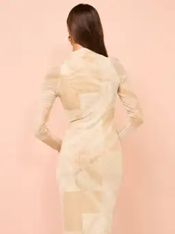 Crafted from a semi sheer fabrication, this maxi dress boasts a high neckline and long sleeves.