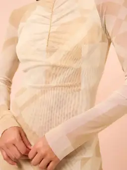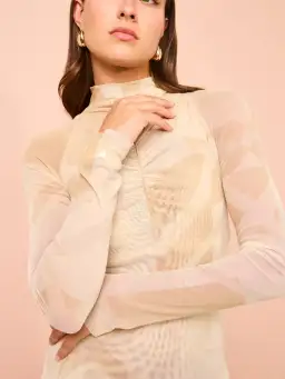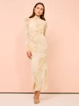 Crafted from a semi sheer fabrication, this maxi dress boasts a high neckline and long sleeves.