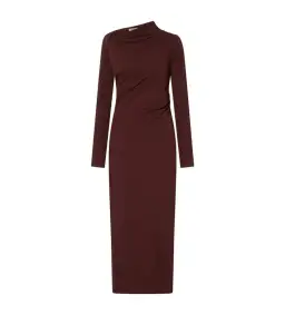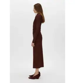 The Mai Long Sleeve Dress features a twisted neckline that adds a unique touch to its sleek design. Crafted for a close fit, it includes tucks along the side seams, creating a flattering silhouette that gracefully contours the body. The mid-length column skirt and side seam invisible zip closure complete the elegant look, while the dress is fully lined for comfort and refinement.