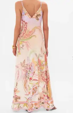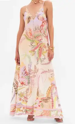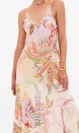 The Cosmic Tuscan Button Front Strappy Dress embodies a vivacious pastel world of delicate butterflies dancing amongst textural florals and flourishes. Indulge in the allure of this stunning silk maxi dress. Crafted to perfection, it boasts a chic longline silhouette with a lush V neckline falls into a flounced skirt that danced at the ankles. The delicate shoulder straps showcase intricate craftsmanship and attention to detail with final touches of opulence in the crystal embellishments capturing the light with every step you take. Embrace the beauty and sophistication of this CAMILLA silk maxi dress, designed to make a statement. . Explore more from the Amore Mio collection.