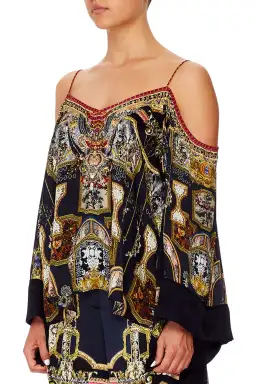Much like the hidden rooms of Fontainebleau, the Midnight Meeting Flare Sleeve Top combines golden highlights with sumptuous prints. This off shoulder top features an alluring cold shoulder design with a soft V-neck, contrast cuff panel and crystal embellishment detail. Pair with fitted denim or our Midnight Meeting Harem Pants for some everyday opulence.