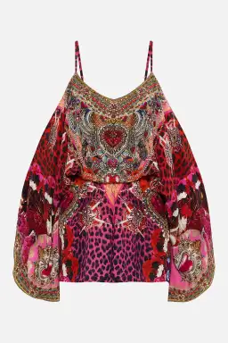 An elixir of raspberry sorbet upon the gaze, the Artesania Mania Drop Shoulder Playsuit captures the imaginations with vibrant hot pink leopard print, metallic sworded shields and ivory botanical cascades. Crafted from silk, this luxury playsuit features a draped wide statement sleeve, hand-placed crystals upon the neckline, a relaxed mini silhouette and pocket details.