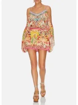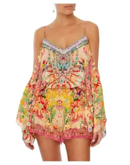 Wrapped in a kaleidoscope of memories, the Kimono Kisses Drop Shoulder Playsuit details Japan's brilliant floral blooms across an ethereal hand-painted print. Crafted from pure silk in a sensuous short-length silhouette, this enchanting off-the-shoulder playsuit features gently flared sleeves, a printed sash-tie belt and a luminous crystal-studded neckline.