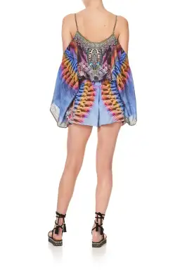 Statement shades of animal print amble beautifully across pure CAMILLA silk in the Love On The Wing Drop Shoulder Playsuit. This festival style features a playful drop shoulder with split sleeves, elasticated waistband and is cut in a mini length finished with side pockets. The majestic print is inspired by the colourful beauty of nature so shine bright at your next summer soiree.