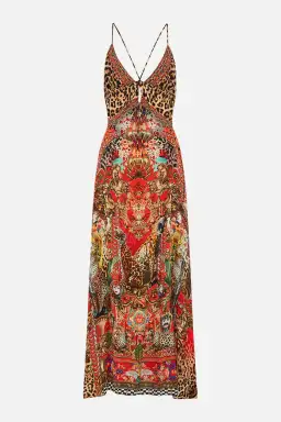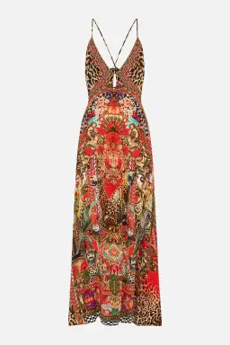 The From Generation To Generation Strappy Dress With Cut Out depicts archways into a world of wilderness and ancient symbols set amongst rich ruby reds. Finely crafted in signature silk, this statement CAMILLA maxi dress features front and back cut out details, back bodice tie, centre back zip enclosure securing the flowy maxi silhouette.