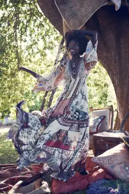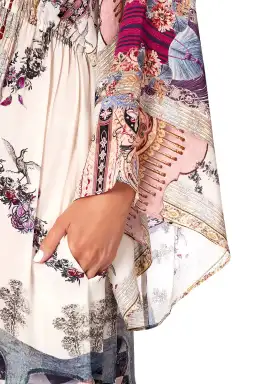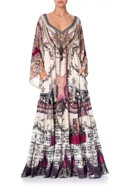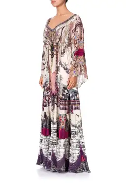 Curious as the obscure antiques hidden away in Parisian laneways, the Violet City Gathered Panel Dress exudes effortless grace. This printed maxi dress features a flattering V neckline, tiered skirt, digitally printed silk, as well as neckline crystals as detail.