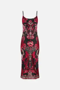 The Sisterhood Of The Rose Long Bias Slip captivates the gaze with a sea of midnight hues adorned with poppies dipped in crimson and cream, roses dancing amidst leafy cascades and subtle baroque detailing that accompanies gemstone amulets.