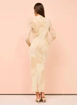 Slip into the elevated Camilla & Marc Esra Dress in Escra Print. Crafted from a semi sheer fabrication, this maxi dress boasts a high neckline and long sleeves. Perfect for winter escapes, weddings, and formal events, make a statement in this luxurious piece.