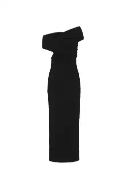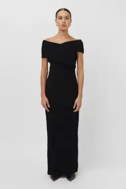 The Toledo is crafted from a unique textured cotton-based fabric in a classic black hue that gives the Toledo its own moment. The off-shoulder dress is fitted in the bodice and falls to a straight-line silhouette that finishes just below the knee with a high split on the right of the skirt.