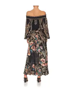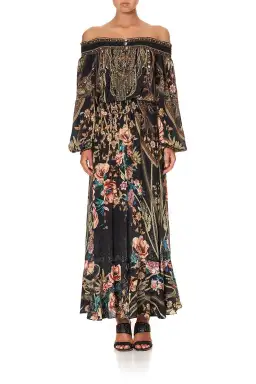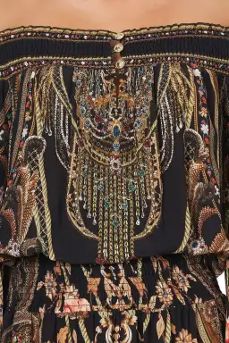 Show off those glorious summer shoulders in the CAMILLA Belle Of The Baroque Off Shoulder Shirred Dress. This stunning silhouette takes ornate detailing printed on luxurious black silk and adds hints of feline femininity. The print placement across this garment is truly glorious. Reclining leopards are found across the inner arms while gold and neutral animal prints drape decorously in flattering lines. This long dress has romantic elements with an off-the-shoulder neckline and maxi skirt bordered by shirred cuffs, waist and neckline. A button front provides neckline detail while CAMILLA crystals frame the décolletage. A perfect occasion dress.
