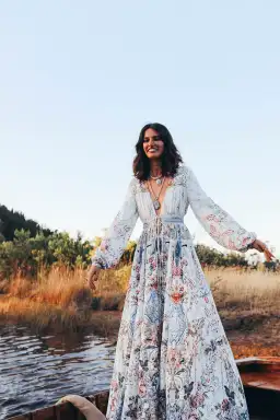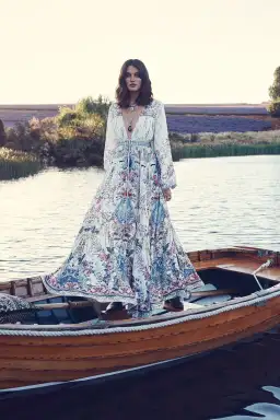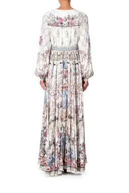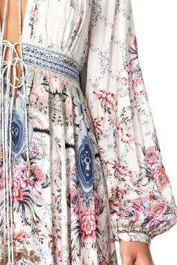 Inspired by the effortless seaside high life of the Cote d'Azur, the Southern Belle Peasant Dress with Tie Front exudes elegant charm. This lush maxi dress features alluring gathering at waistline, sumptuous all-over print, lightweight ties, as well as hand-placed neckline crystals as detail.