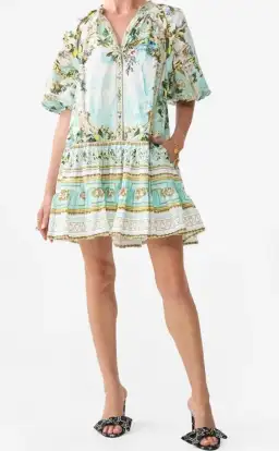Designed in Australia, The Venus On A Vespa Puff Sleeve Shirt Dress exudes placid blue skies amid ornate archways and gilded borders, a collection reimagining intricate illustrations by Lezio Lopez. Lovingly handcrafted, this puff sleeve shirt dress is a celebration of feminine style. A relaxed fit and short length combine with a tiered skirt and voluminous puff sleeves for a chic silhouette.