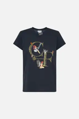 The To Catch A Spider Slim Fit Round Neck T-Shirt sports a sea of midnight hues complete with golden intricacies that melt into our namesake initialling and dainty fairies that unwind amidst it all.