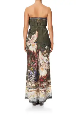 In heartfelt tribute to the lush botanical arrangements at country socials, the Watchful Wings Strapless Jumpsuit with D Ring Belt embraces Australiana. With a lavish olive background, this silk jumpsuit features an alluring elasticated neckline, practical in seam pockets, digitally printed silk, as well as delicate neckline crystals as detail.