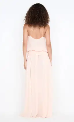 Camille Blouson Dress in Peach. This stunning maxi dress is perfect for spring dressing, whether you're looking for an elegant vacation dress, a flowing maxi for casual wear, or a beautiful wedding guest dress.