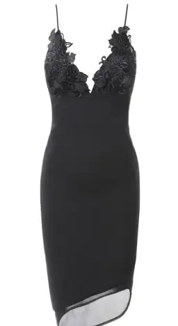 Black is back in the hottest shape dress of the year. The sexy slip shape of Caprice, teamed with gorgeous lace applique to the bust makes her the most coveted LBD. Cut low on the bust and back. Ultra thin adjustable spaghetti straps and an asymmetric hem with mesh edging complete this simple sexy silhouette. Made from stretch crepe with mesh detailing and lace applique.