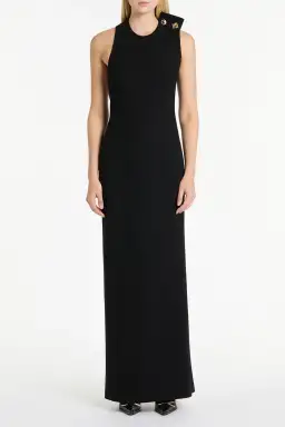 Crafted from signature black crepe, this gown effortlessly skims the silhouette that takes homage from decades of artisanal tailoring. The statement charm buttons frame the statement shoulder detail, while the back opens with a sweeping curve. The gown can be styled with the complimentary flower pin for an alternative styling option.