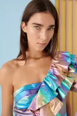 Want to shine at a party? This mini, asymmetric and metallic dress is the perfect ally! Its fitted cut and ruffle details will make you show off a spectacular figure.
