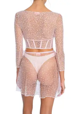 100% Polyester tulle with hand beaded sequins. Delicate seed beaded cuffs and hem for extra detail.
