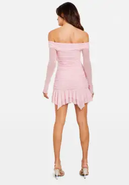 The OFF SHOULDER MESH ROSE MINI DRESS by CHOSEN is your go to dress for the season. Made from an ultra soft stretch mesh, featuring ruching at side seams and top of sleeves, and double layered handkerchief hemline.