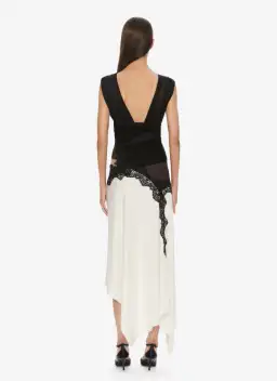 The Baile Wrapped Tulle Tank Dress contrasts delicacy with structure. Draped sheer tulle wraps the torso to reveal asymmetric cutouts, flowing into a fluid crepe skirt traced with scalloped lace. The result is a study in form and transparency - sensuality anchored in restraint.