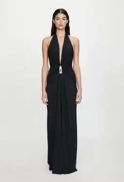 The Crystal Pendant Ruched Halter Dress is cut from matte stretch lycra, designed with a plunging neckline that gathers into a central crystal pendant. The fluid silhouette falls from the waist into a soft column skirt, balanced by an open back and full length hemline.
