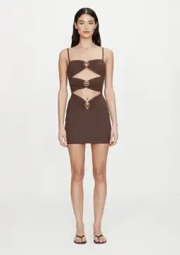 A fitted mini dress in stretch lycra, defined by ruched panels that gather into custom mineral stone hardware. Cut with fine shoulder straps and precise front cutouts, the silhouette frames the body with fluid symmetry and sculptural balance.