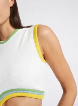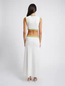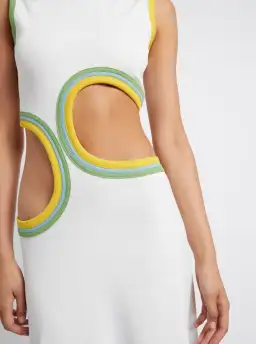 The Multi Paisley Cut Torso Dress is cut from a heavy luxe rib, featuring signature Christopher Esber asymmetrical torso cut-outs with contrast bind detailing. The tank dress falls to a flared, full-length hem with a crew neckline.