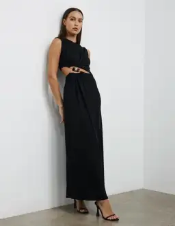 The Ruched Quartz Abacus Dress is a maxi silhouette elevated with its sensual waist cutout and embellished with gold-toned hardware and stones.