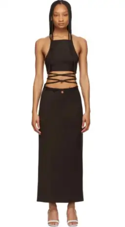Stretch woven wool blend, self tie halter strap, cut out featuring wraparound self tie straps at waist, cut out with button fastening at back, darts and concealed zip closure at back waistband, central cent at back hem, unlined.