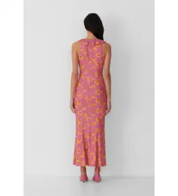 The Wolf Gang Circe Maxi Dress features a V-neck, sleeveless design, and a hidden back zipper closure. It has a ruffled detail at the bodice and is partially lined. The dress is made of 56% viscose and 44% rayon and is lined with 97% polyester and 3% elastane
