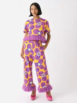 A chic embodiment of casual elegance, the Clara Shirt will be your favourite! Cropped, short sleeved and with a round neck, topped off by a fun and original purple tassel finish. In an eye-catching yellow and purple daisy print, you can pair this set with the matching pants. It's fun, its different and oh-so-unique!