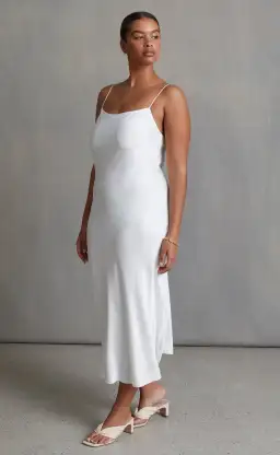 Washed silk bias cut midi dress slight scoop neckline cut on the bias for flattering, skimming fit fine rouleau straps in self. bra friendly.